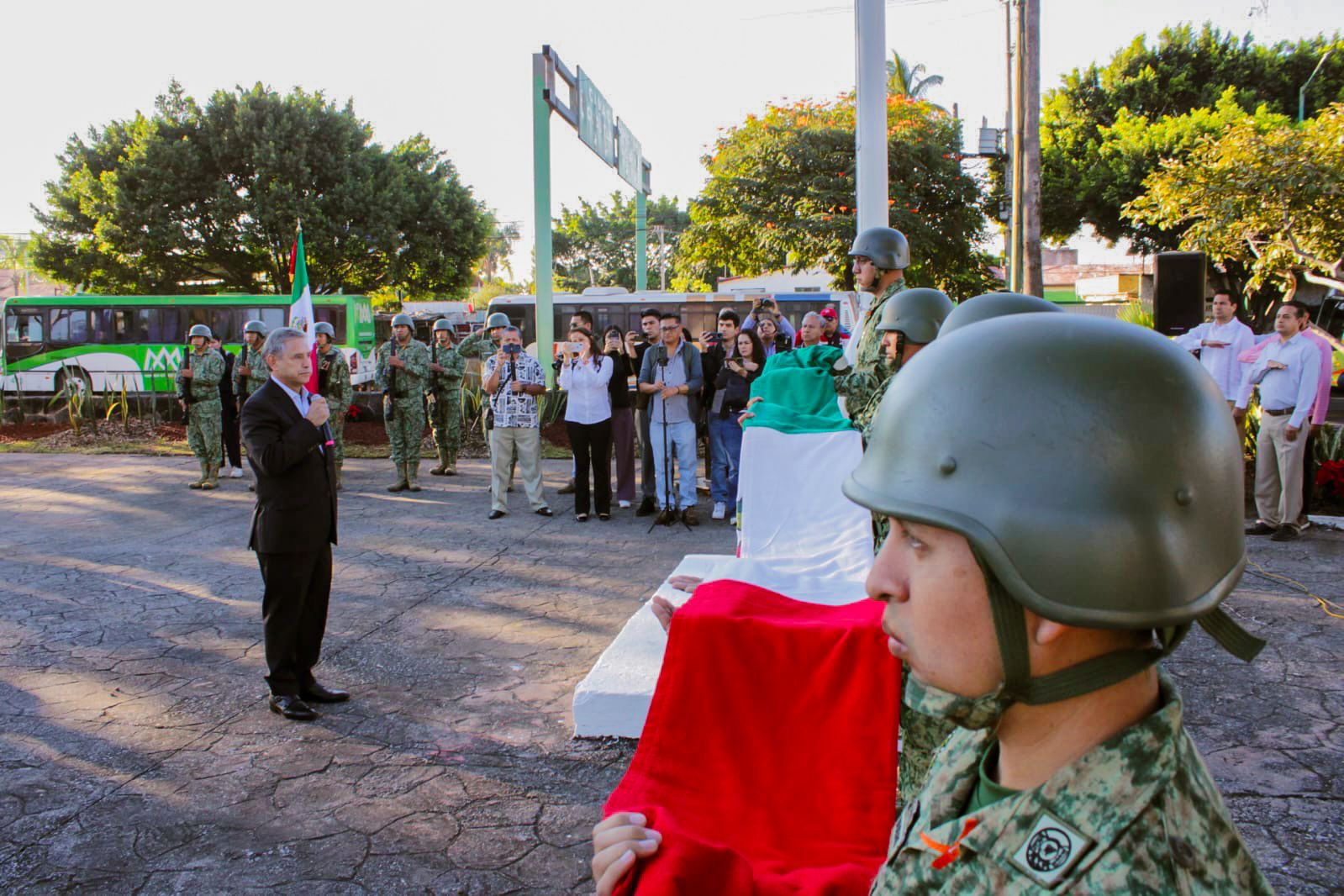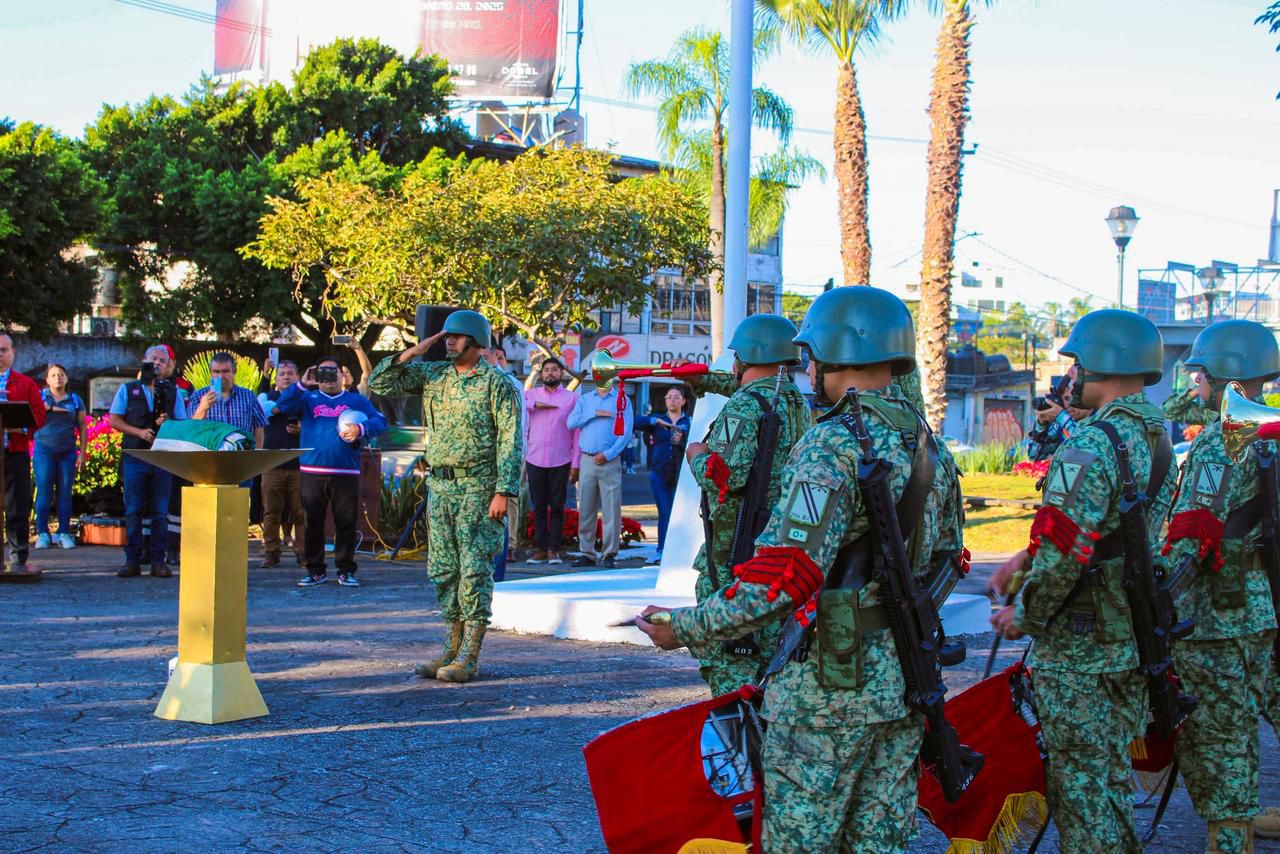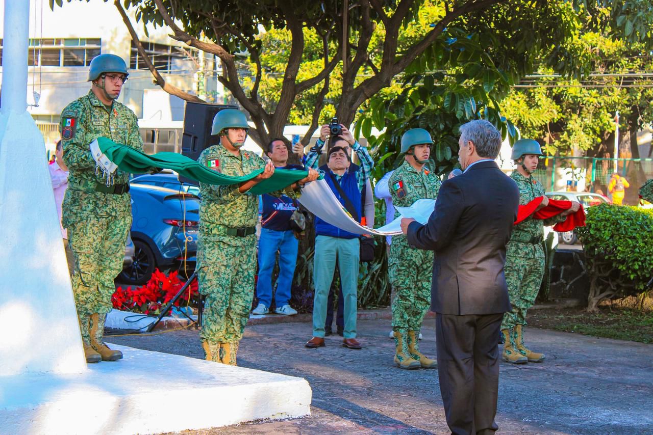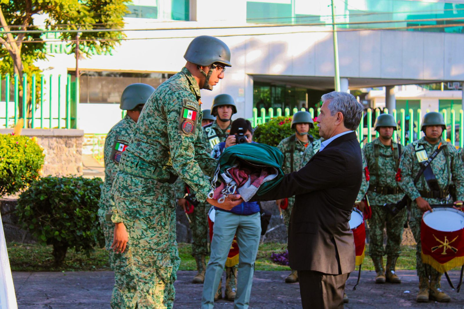 Acompañado por integrantes del Cabildo y del gabinete legal y ampliado, el alcalde participó en los honores a cargo de elementos del 21° Batallón de Infantería, donde se realizó la incineración del lábaro patrio conforme al artículo 54 Bis de la Ley sobre el Escudo, la Bandera y el Himno Nacional, para continuar con el abanderamiento de la escolta y la toma de protesta correspondiente.