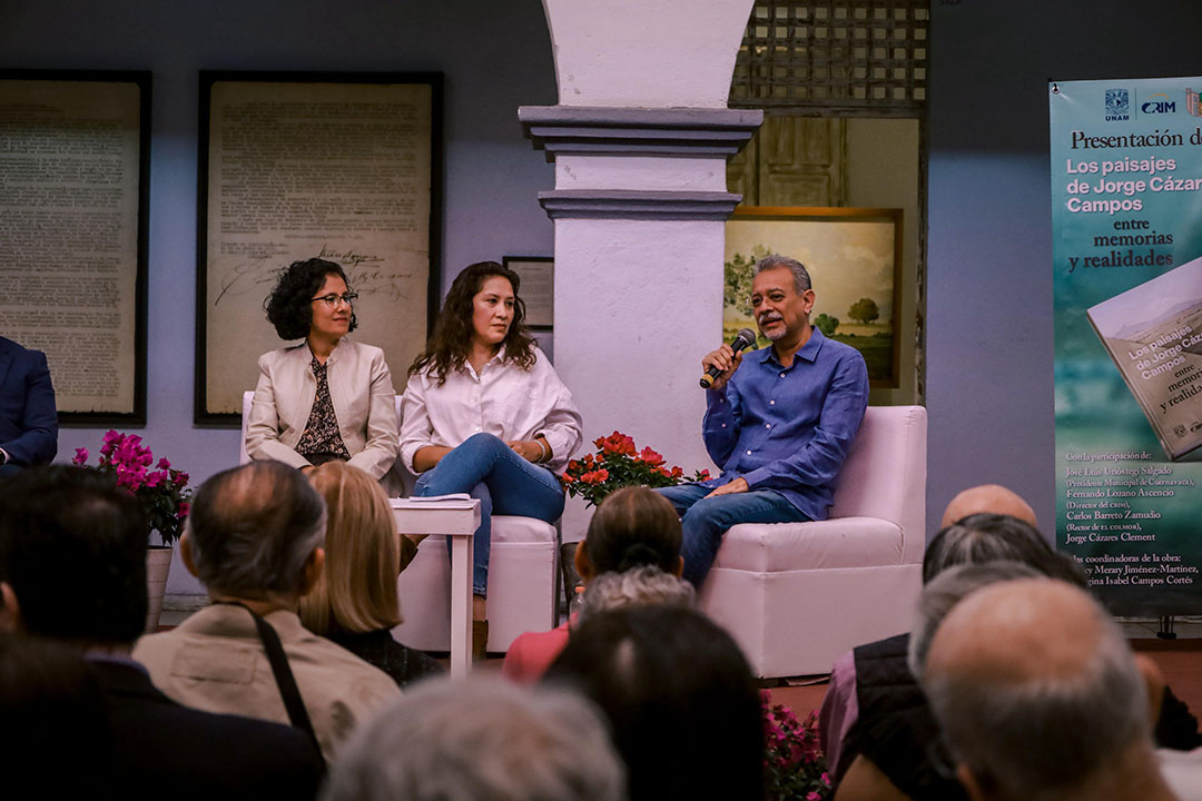 En su participación, Fernando Lozano Ascencio, director del CRIM, explicó que el libro reúne textos de 14 autoras y autores organizados en tres secciones: la primera aborda la vida y la memoria artística del pintor; la segunda propone lecturas conceptuales y vivenciales del paisaje; y la tercera contrasta obras específicas de Jorge Cázares Campos con las transformaciones ambientales y sociales de los entornos representados.