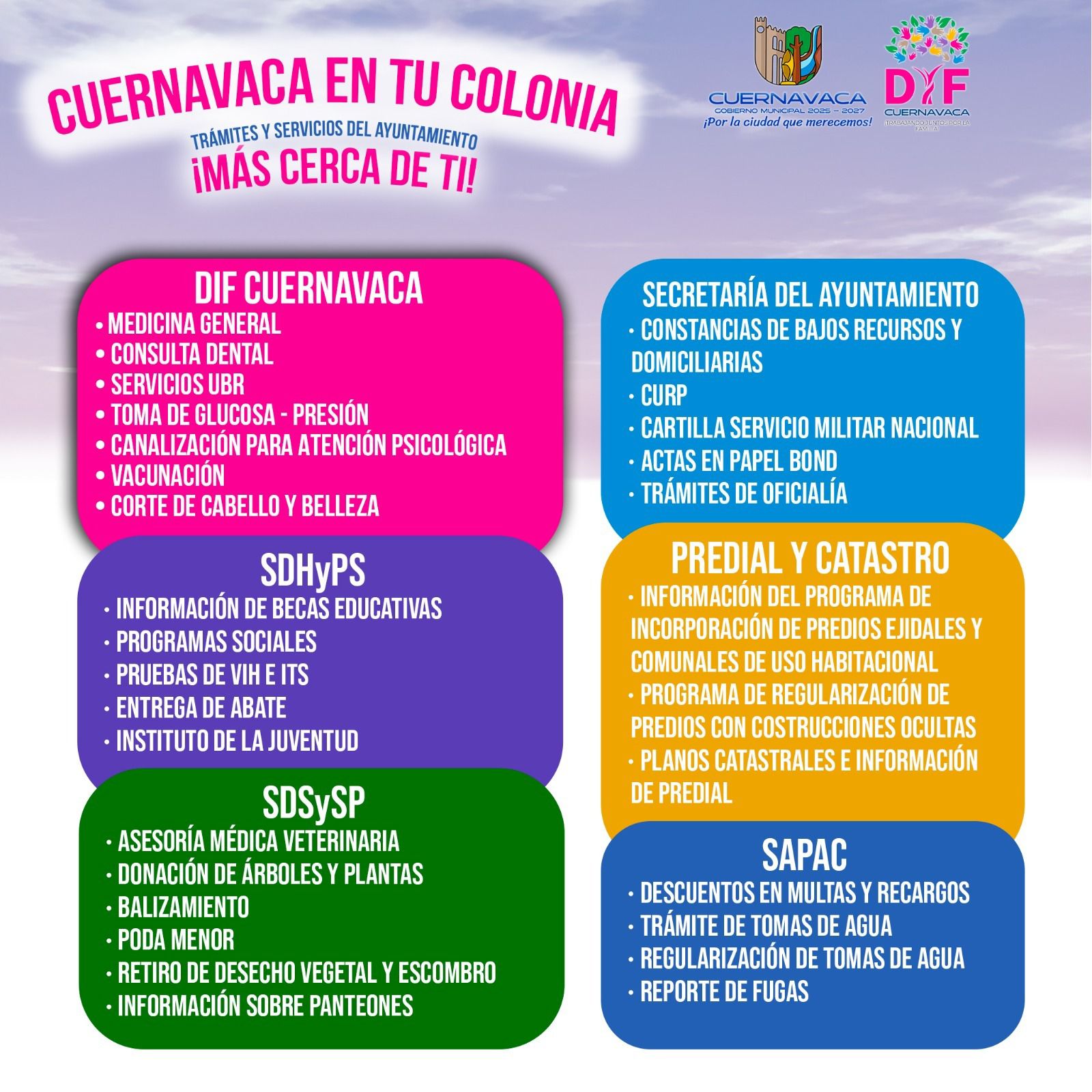 Por parte del DIF Cuernavaca se brindan: consultas médicas generales y dentales; vacunación; rehabilitación física a través de la Unidad Básica de Rehabilitación (UBR); canalización para atención psicológica; toma de glucosa- presión; y corte de cabello.
