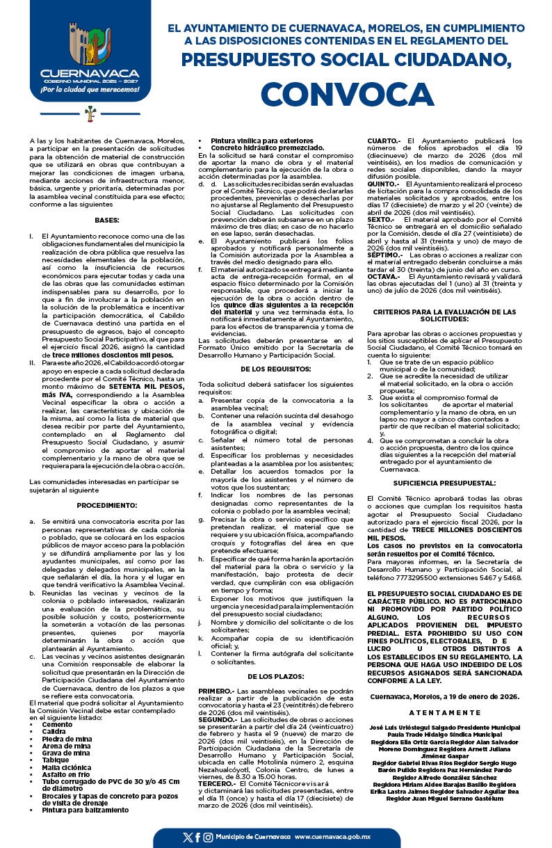 El Ayuntamiento de Cuernavaca, encabezado por el alcalde José Luis Urióstegui Salgado, informa a la ciudadanía que se encuentra abierto el proceso de participación del Presupuesto Social Ciudadano 2026, una herramienta que permite atender requerimientos prioritarios de infraestructura menor en colonias y comunidades, mediante la asignación de material de construcción para obras en espacios públicos.