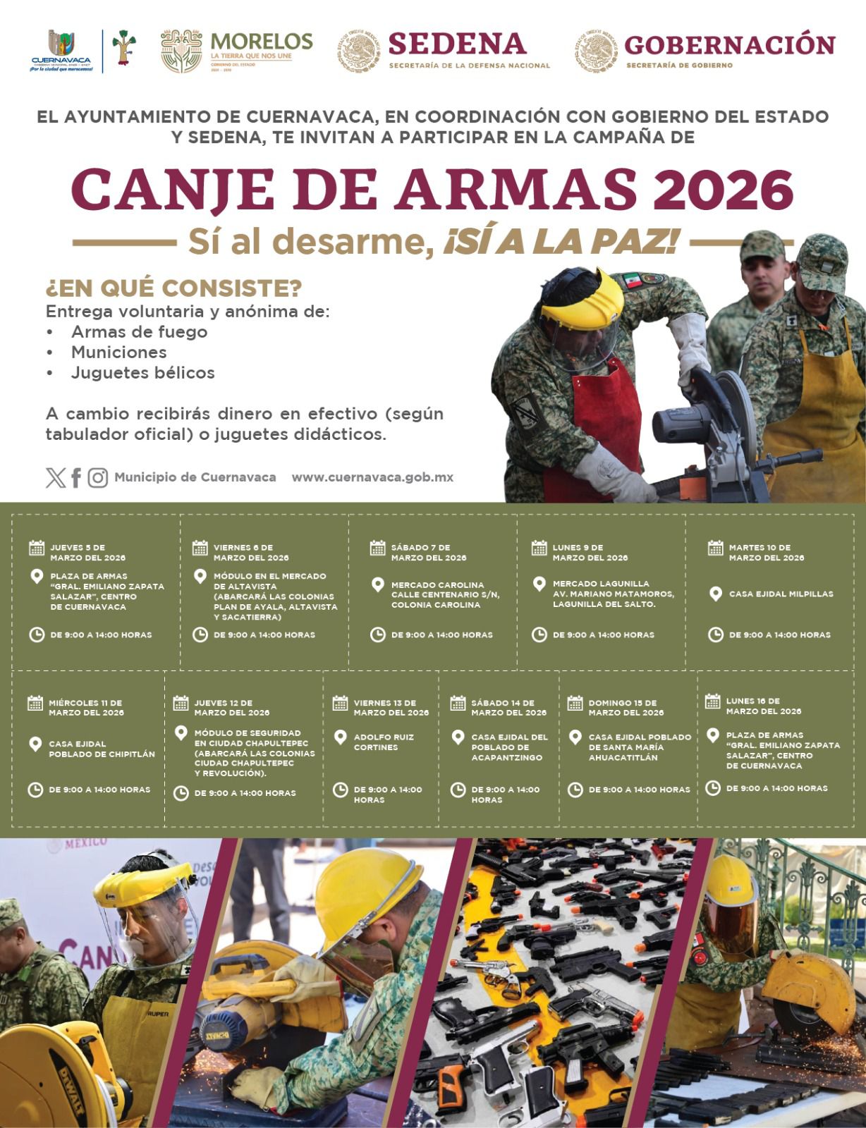 Del 05 al 16 de marzo, Cuernavaca será sede de la campaña nacional “Sí al desarme, sí a la paz”, una estrategia coordinada entre el Gobierno Federal, el Gobierno del Estado y el Ayuntamiento capitalino, encabezado por el alcalde José Luis Urióstegui Salgado, con el objetivo de prevenir delitos de alto impacto y fortalecer la seguridad en el municipio mediante la entrega voluntaria y anónima de armas de fuego a cambio de incentivos económicos.