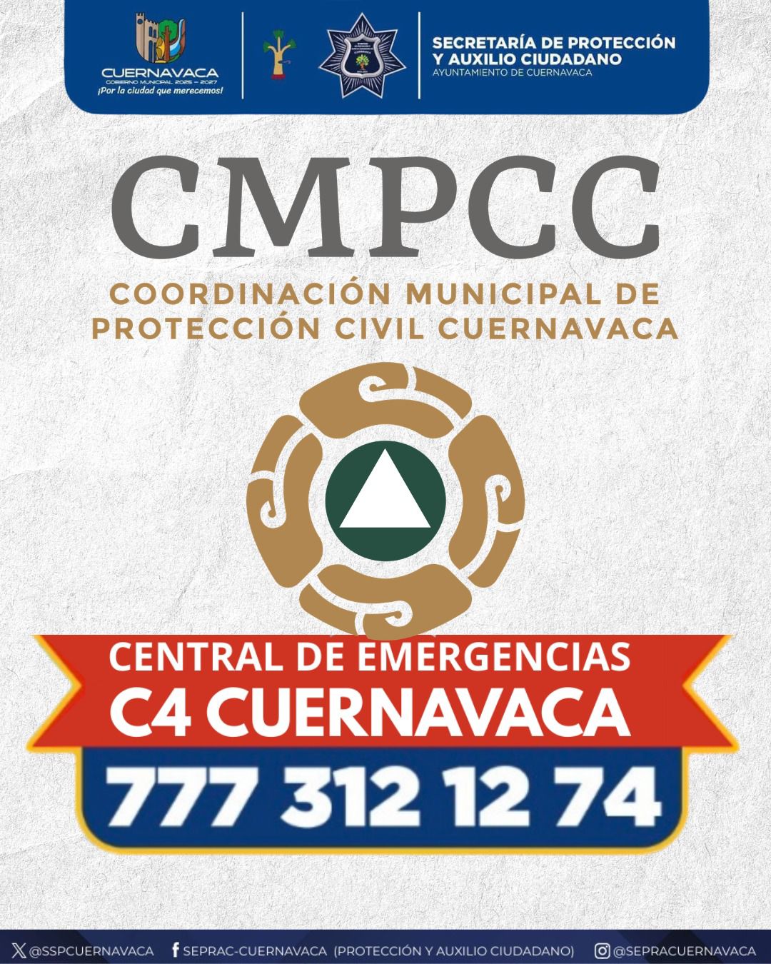 La SEPRAC exhorta a la ciudadanía a reportar cualquier situación de riesgo, mantenerse atenta a la información oficial y evitar difundir datos no verificados. Ante cualquier emergencia, la población puede comunicarse al C4 Cuernavaca al teléfono 777 312 12 74.