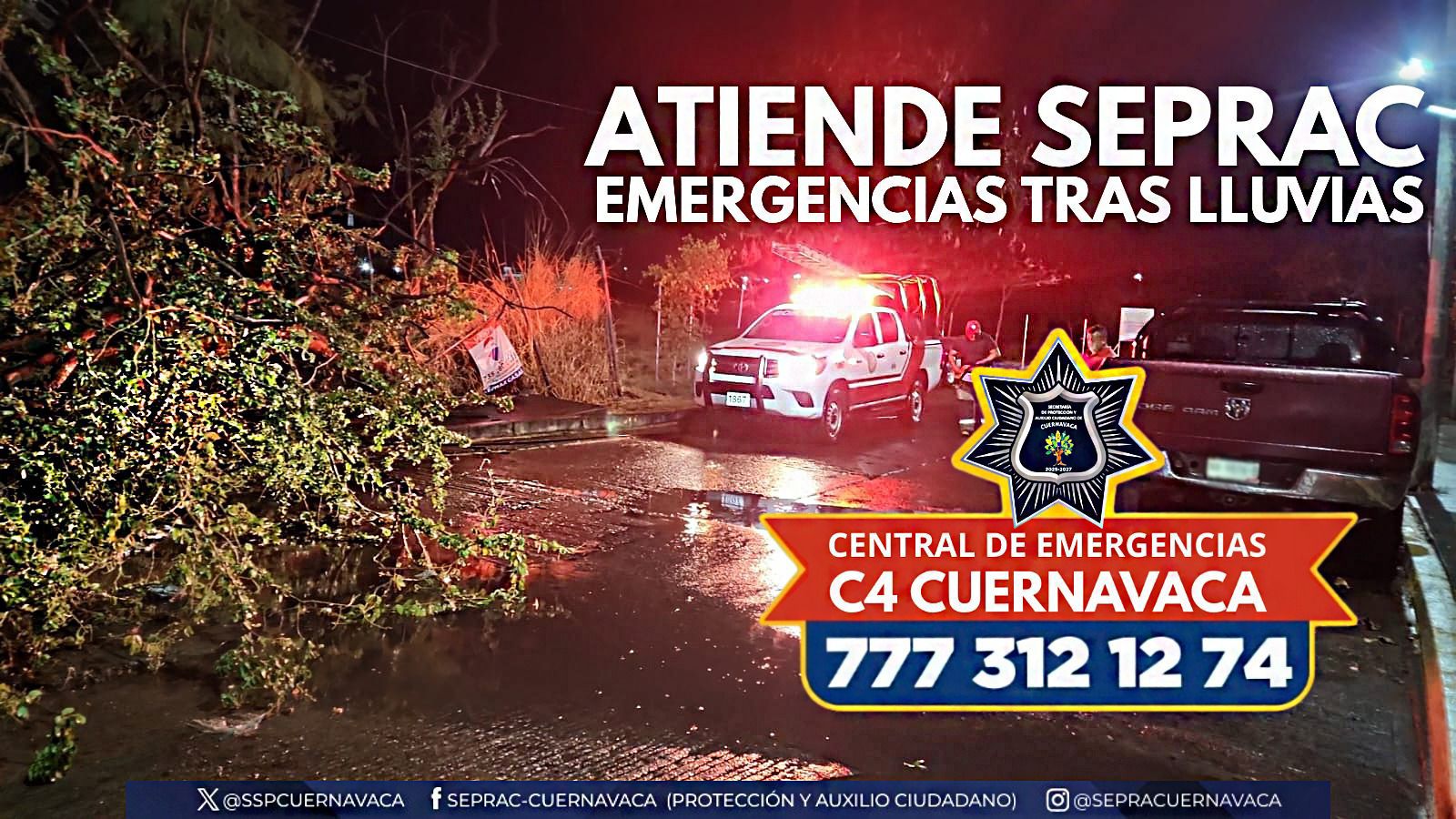La Secretaría de Protección y Auxilio Ciudadano (SEPRAC) informa que, derivado de la lluvia registrada la noche del martes en Cuernavaca, elementos del Heroico Cuerpo de Bomberos y de Protección Civil atendieron diversas emergencias en distintos puntos del municipio, con el objetivo de salvaguardar la integridad de la población y reducir riesgos.