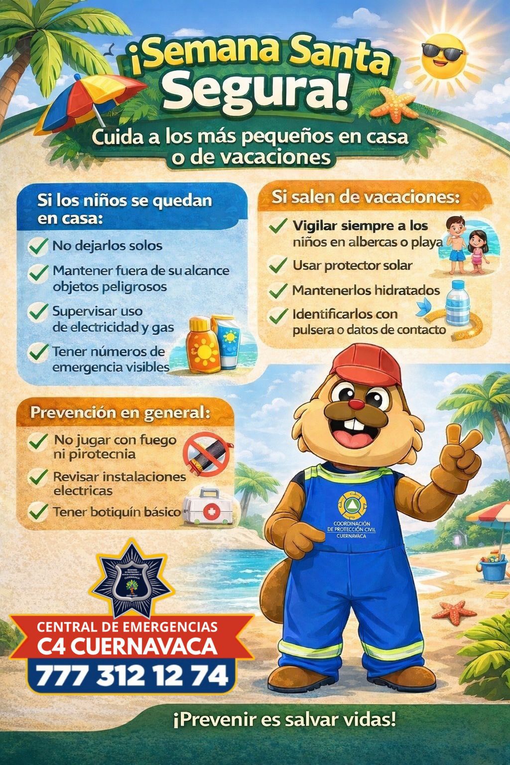 Dando continuidad a las medidas de prevención de Semana Santa 2026, el Ayuntamiento de Cuernavaca, a través de la Secretaría de Protección y Auxilio Ciudadano (SEPRAC) y la Coordinación Municipal de Protección Civil, hace un llamado a la ciudadanía a reforzar las acciones de cuidado durante el periodo vacacional, especialmente en el hogar y en la protección de niñas y niños, con el objetivo de prevenir accidentes.
