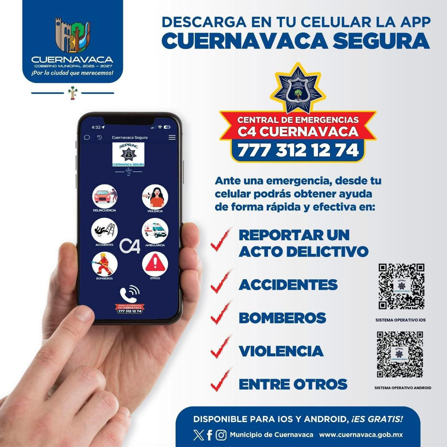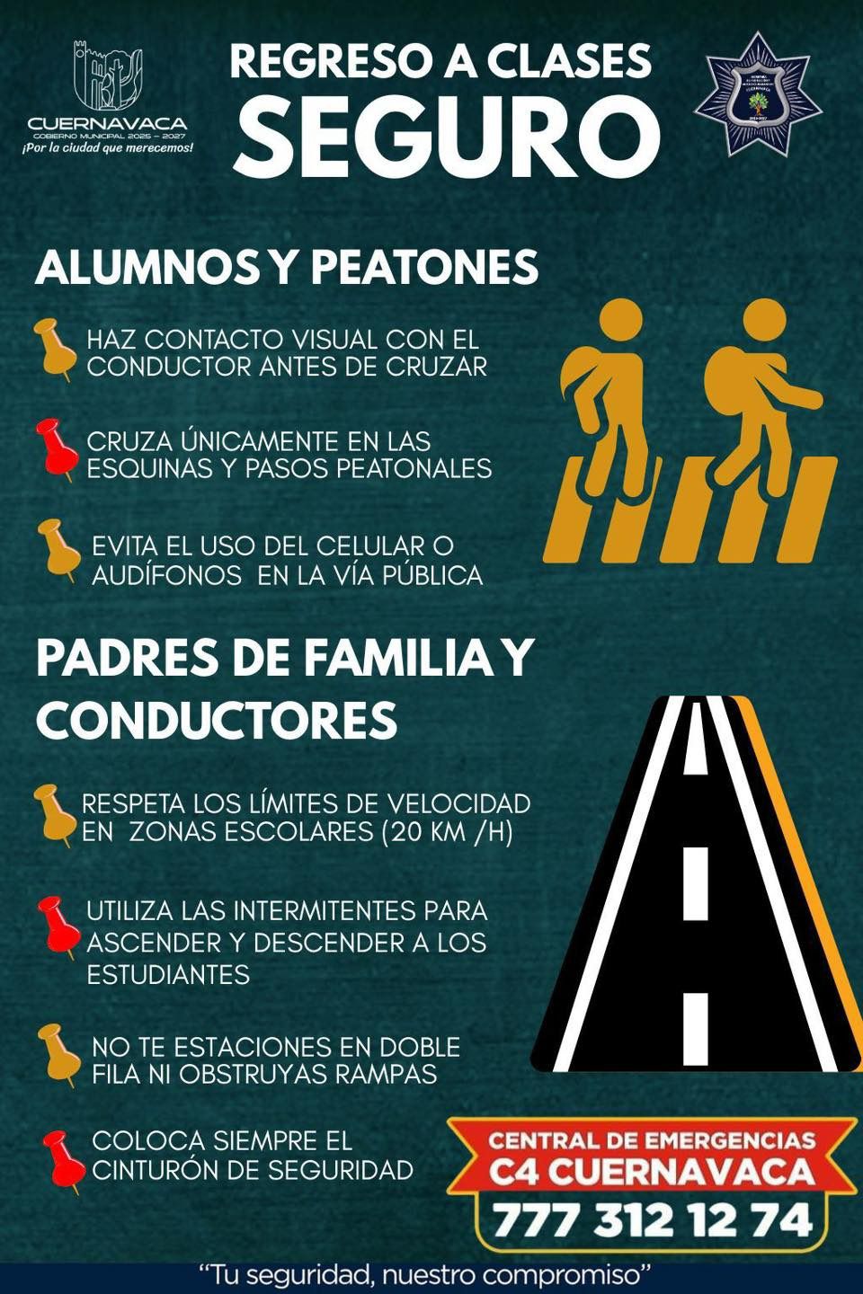 Finalmente, la SEPRAC pone a disposición de la ciudadanía el número del C4 777 312 1274, para reportar cualquier incidente vial o emergencia, con atención de Protección Civil, Bomberos y cuerpos de seguridad.